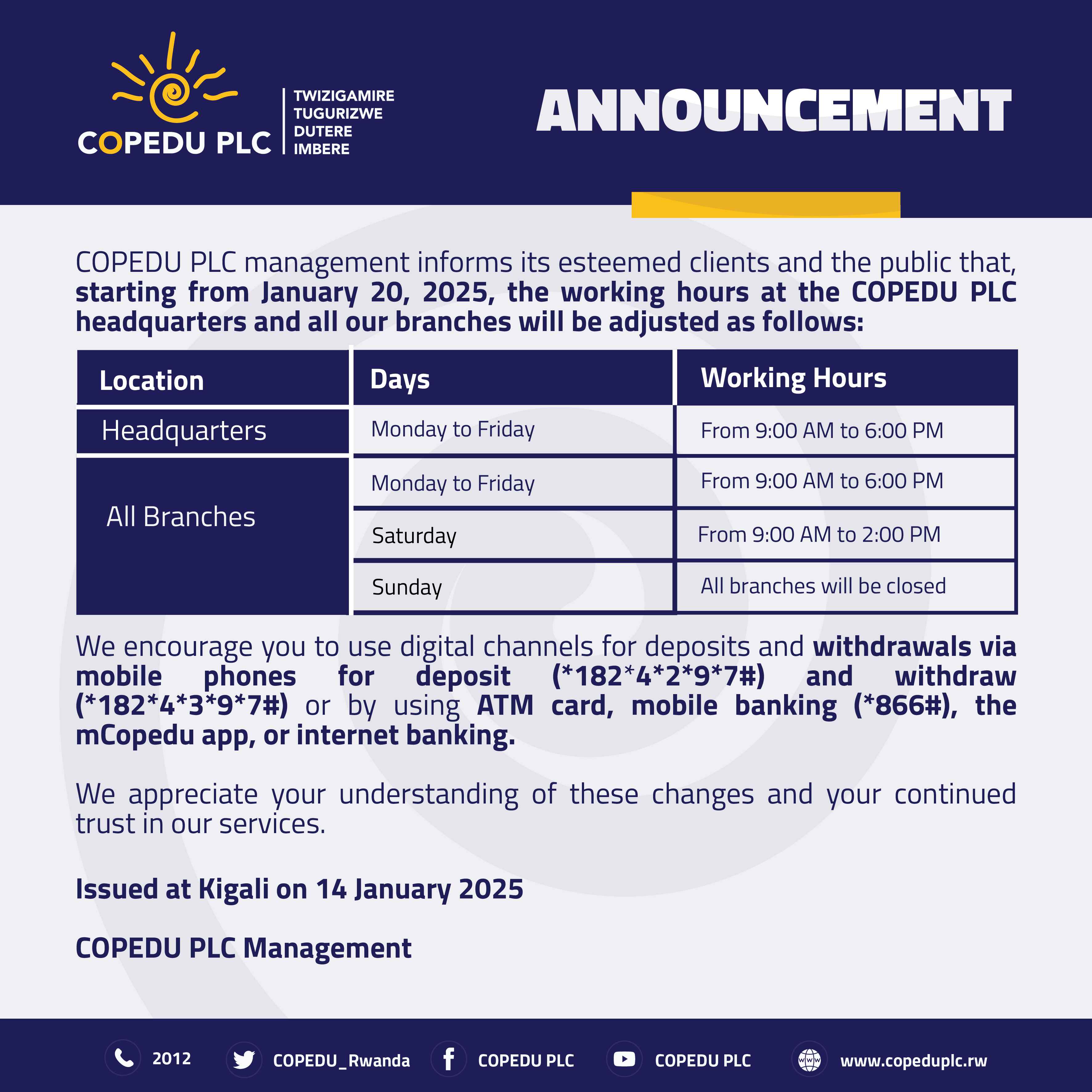 Announcement regarding working hours